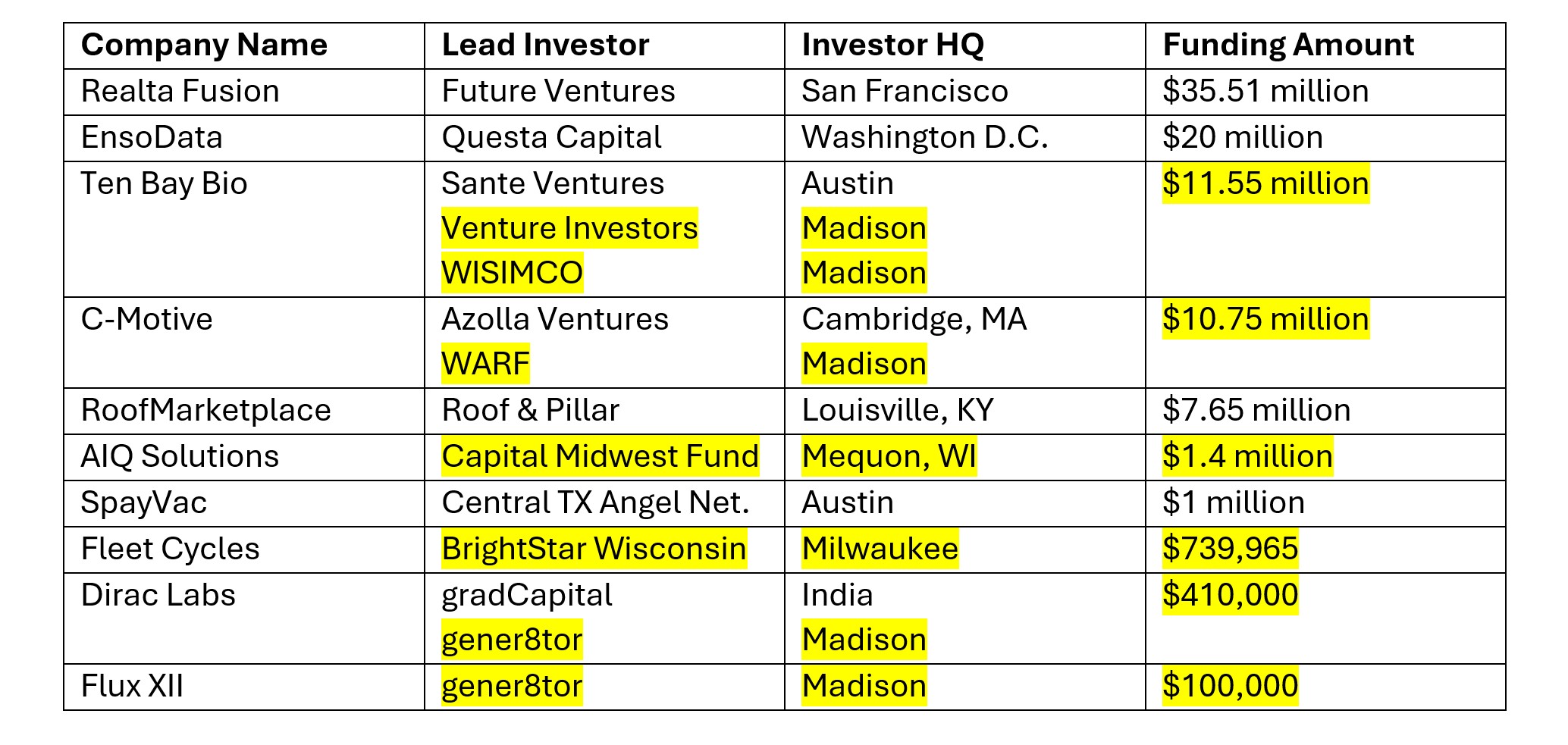 Highlighted deals indicate investment dollars from Wisconsin.