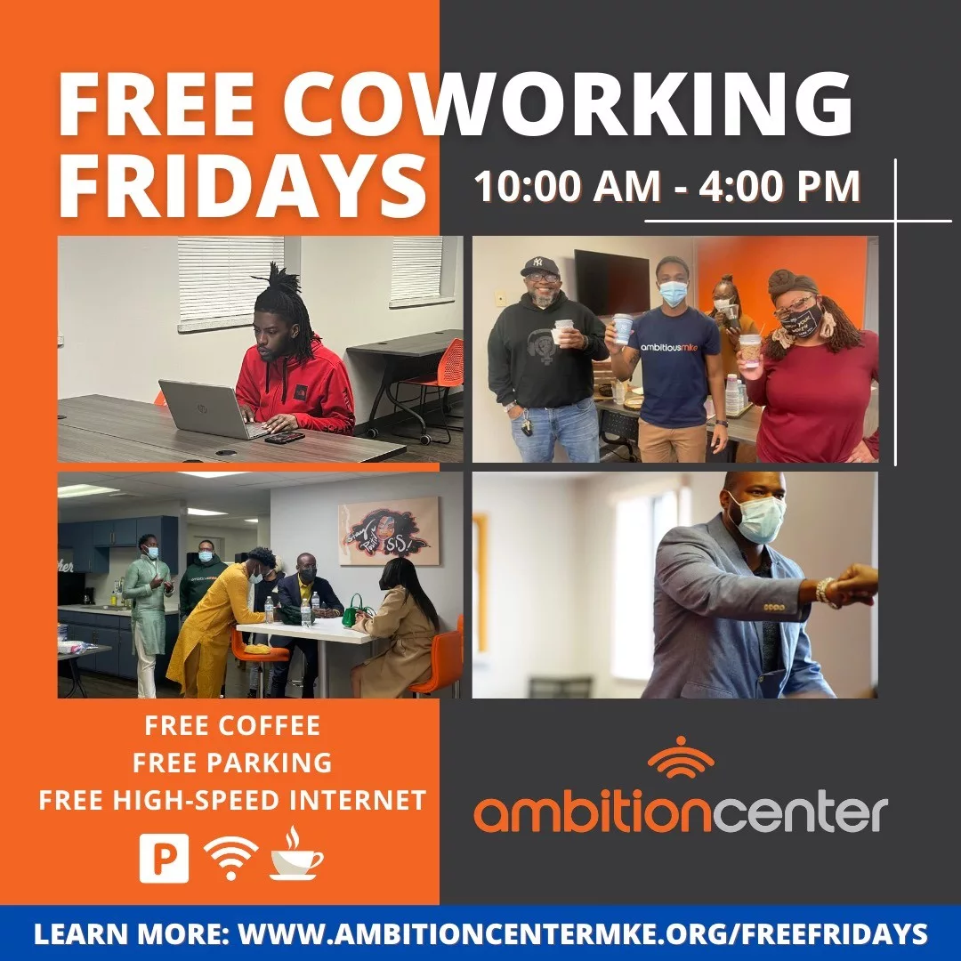 In September 2021, Marcell Jackson opened coworking space Ambition Center MKE. Located in Milwaukee’s Riverwest neighborhood, the space is intentional about welcoming BIPOC entrepreneurs and freelancers to join their workplace community. Ambition Center MKE offers a number of features unique to the typical coworking space. In addition to the workspaces and office services that have … Free Coworking Fridays at Ambition Center MKE